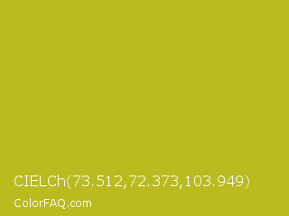 CIELCh 73.512,72.373,103.949 Color is a normal yellow color and the nearest color is Acid Green #b0bf1a. Hex code #b9bb1e and RGB value is rgb(185,187,30). In RGB color space, this color is composed of 73% red, 73% green, 12% blue, In CMYK color space, this color is composed of 1% cyan, 0% magenta, 84% yellow , 27% black , In HSL color space, this color has a hue angle of 61° , 72% saturation and 43% lightness.
