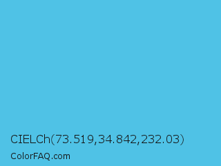 CIELCh 73.519,34.842,232.03 Color is a light blue color and the nearest color is Picton Blue #45b1e8. Hex code #4fc2e6 and RGB value is rgb(79,194,230). In RGB color space, this color is composed of 31% red, 76% green, 90% blue, In CMYK color space, this color is composed of 66% cyan, 16% magenta, 0% yellow , 10% black , In HSL color space, this color has a hue angle of 194° , 75% saturation and 61% lightness.