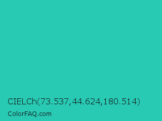 CIELCh 73.537,44.624,180.514 Color is a normal cyan color and the nearest color is Maximum Blue Green #30bfbf. Hex code #28cab4 and RGB value is rgb(40,202,180). In RGB color space, this color is composed of 16% red, 79% green, 71% blue, In CMYK color space, this color is composed of 80% cyan, 0% magenta, 11% yellow , 21% black , In HSL color space, this color has a hue angle of 172° , 67% saturation and 47% lightness.