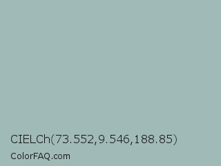 CIELCh 73.552,9.546,188.85 Color is a light cyan color and the nearest color is Shadow Green #9ac2b8. Hex code #a0bab7 and RGB value is rgb(160,186,183). In RGB color space, this color is composed of 63% red, 73% green, 72% blue, In CMYK color space, this color is composed of 14% cyan, 0% magenta, 2% yellow , 27% black , In HSL color space, this color has a hue angle of 173° , 16% saturation and 68% lightness.