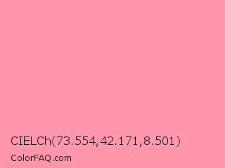 CIELCh 73.554,42.171,8.501 Color is a light red color and the nearest color is Schauss Pink #ff91af. Hex code #ff96ab and RGB value is rgb(255,150,171). In RGB color space, this color is composed of 100% red, 59% green, 67% blue, In CMYK color space, this color is composed of 0% cyan, 41% magenta, 33% yellow , 0% black , In HSL color space, this color has a hue angle of 348° , 100% saturation and 79% lightness.