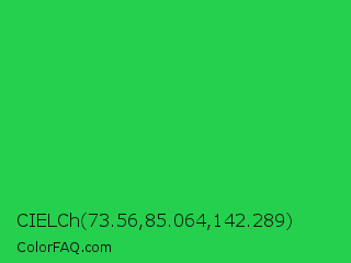 CIELCh 73.56,85.064,142.289 Color is a normal green color and the nearest color is Malachite #0bda51. Hex code #24d04d and RGB value is rgb(36,208,77). In RGB color space, this color is composed of 14% red, 82% green, 30% blue, In CMYK color space, this color is composed of 83% cyan, 0% magenta, 63% yellow , 18% black , In HSL color space, this color has a hue angle of 134° , 70% saturation and 48% lightness.