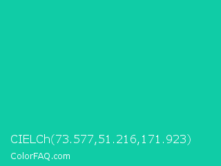 CIELCh 73.577,51.216,171.923 Color is a normal cyan color and the nearest color is Amazonite #00c4b0. Hex code #10cca6 and RGB value is rgb(16,204,166). In RGB color space, this color is composed of 6% red, 80% green, 65% blue, In CMYK color space, this color is composed of 92% cyan, 0% magenta, 19% yellow , 20% black , In HSL color space, this color has a hue angle of 168° , 85% saturation and 43% lightness.