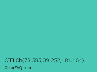 CIELCh 73.585,39.252,181.164 Color is a normal cyan color and the nearest color is Puerto Rico #3fc1aa. Hex code #49c8b5 and RGB value is rgb(73,200,181). In RGB color space, this color is composed of 29% red, 78% green, 71% blue, In CMYK color space, this color is composed of 64% cyan, 0% magenta, 10% yellow , 22% black , In HSL color space, this color has a hue angle of 171° , 54% saturation and 54% lightness.