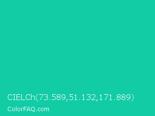 CIELCh 73.589,51.132,171.889 Color is a normal cyan color and the nearest color is Amazonite #00c4b0. Hex code #12cca6 and RGB value is rgb(18,204,166). In RGB color space, this color is composed of 7% red, 80% green, 65% blue, In CMYK color space, this color is composed of 91% cyan, 0% magenta, 19% yellow , 20% black , In HSL color space, this color has a hue angle of 168° , 84% saturation and 44% lightness.