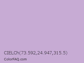 CIELCh 73.592,24.947,315.5 Color is a light purple color and the nearest color is Tropical Violet #cda4de. Hex code #c7abd5 and RGB value is rgb(199,171,213). In RGB color space, this color is composed of 78% red, 67% green, 84% blue, In CMYK color space, this color is composed of 7% cyan, 20% magenta, 0% yellow , 16% black , In HSL color space, this color has a hue angle of 280° , 33% saturation and 75% lightness.