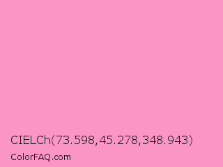 CIELCh 73.598,45.278,348.943 Color is a light rose color and the nearest color is Pale Magenta Pink #ff99cc. Hex code #fb95c6 and RGB value is rgb(251,149,198). In RGB color space, this color is composed of 98% red, 58% green, 78% blue, In CMYK color space, this color is composed of 0% cyan, 41% magenta, 21% yellow , 2% black , In HSL color space, this color has a hue angle of 331° , 93% saturation and 78% lightness.