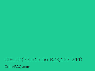 CIELCh 73.616,56.823,163.244 Color is a normal green color and the nearest color is Shamrock #33cc99. Hex code #1ecd95 and RGB value is rgb(30,205,149). In RGB color space, this color is composed of 12% red, 80% green, 58% blue, In CMYK color space, this color is composed of 85% cyan, 0% magenta, 27% yellow , 20% black , In HSL color space, this color has a hue angle of 161° , 74% saturation and 46% lightness.