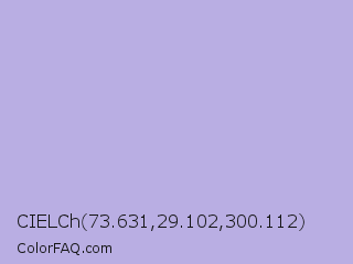 CIELCh 73.631,29.102,300.112 Color is a light indigo color and the nearest color is Maximum Blue Purple #acace6. Hex code #b9aee3 and RGB value is rgb(185,174,227). In RGB color space, this color is composed of 73% red, 68% green, 89% blue, In CMYK color space, this color is composed of 19% cyan, 23% magenta, 0% yellow , 11% black , In HSL color space, this color has a hue angle of 252° , 49% saturation and 79% lightness.