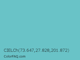 CIELCh 73.647,27.828,201.872 Color is a normal cyan color and the nearest color is Downy #6fd0c5. Hex code #69c3c7 and RGB value is rgb(105,195,199). In RGB color space, this color is composed of 41% red, 76% green, 78% blue, In CMYK color space, this color is composed of 47% cyan, 2% magenta, 0% yellow , 22% black , In HSL color space, this color has a hue angle of 183° , 46% saturation and 60% lightness.