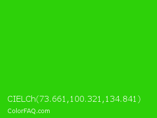CIELCh 73.661,100.321,134.841 Color is a normal green color and the nearest color is Harlequin Green #46cb18. Hex code #2dd109 and RGB value is rgb(45,209,9). In RGB color space, this color is composed of 18% red, 82% green, 4% blue, In CMYK color space, this color is composed of 78% cyan, 0% magenta, 96% yellow , 18% black , In HSL color space, this color has a hue angle of 109° , 92% saturation and 43% lightness.