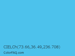 CIELCh 73.66,36.49,236.708 Color is a light blue color and the nearest color is Picton Blue #45b1e8. Hex code #4cc2ec and RGB value is rgb(76,194,236). In RGB color space, this color is composed of 30% red, 76% green, 93% blue, In CMYK color space, this color is composed of 68% cyan, 18% magenta, 0% yellow , 7% black , In HSL color space, this color has a hue angle of 196° , 81% saturation and 61% lightness.