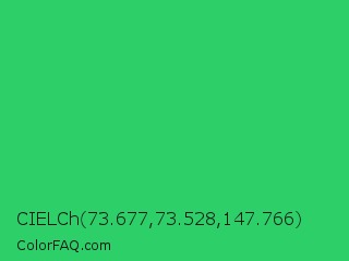 CIELCh 73.677,73.528,147.766 Color is a normal green color and the nearest color is UFO Green #3cd070. Hex code #2dcf69 and RGB value is rgb(45,207,105). In RGB color space, this color is composed of 18% red, 81% green, 41% blue, In CMYK color space, this color is composed of 78% cyan, 0% magenta, 49% yellow , 19% black , In HSL color space, this color has a hue angle of 142° , 64% saturation and 49% lightness.