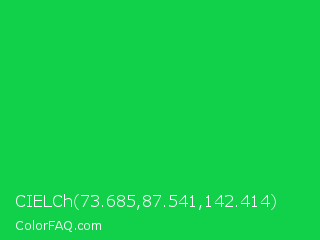 CIELCh 73.685,87.541,142.414 Color is a normal green color and the nearest color is Malachite #0bda51. Hex code #11d14a and RGB value is rgb(17,209,74). In RGB color space, this color is composed of 7% red, 82% green, 29% blue, In CMYK color space, this color is composed of 92% cyan, 0% magenta, 65% yellow , 18% black , In HSL color space, this color has a hue angle of 138° , 85% saturation and 44% lightness.