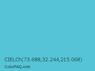 CIELCh 73.688,32.244,215.068 Color is a normal cyan color and the nearest color is Sea Serpent #4bc7cf. Hex code #54c4d6 and RGB value is rgb(84,196,214). In RGB color space, this color is composed of 33% red, 77% green, 84% blue, In CMYK color space, this color is composed of 61% cyan, 8% magenta, 0% yellow , 16% black , In HSL color space, this color has a hue angle of 188° , 61% saturation and 58% lightness.