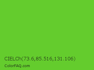 CIELCh 73.6,85.516,131.106 Color is a normal green color and the nearest color is Green RYB #66b032. Hex code #64cc2d and RGB value is rgb(100,204,45). In RGB color space, this color is composed of 39% red, 80% green, 18% blue, In CMYK color space, this color is composed of 51% cyan, 0% magenta, 78% yellow , 20% black , In HSL color space, this color has a hue angle of 99° , 64% saturation and 49% lightness.