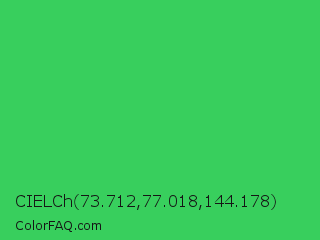 CIELCh 73.712,77.018,144.178 Color is a normal green color and the nearest color is UFO Green #3cd070. Hex code #38cf5d and RGB value is rgb(56,207,93). In RGB color space, this color is composed of 22% red, 81% green, 36% blue, In CMYK color space, this color is composed of 73% cyan, 0% magenta, 55% yellow , 19% black , In HSL color space, this color has a hue angle of 135° , 61% saturation and 52% lightness.
