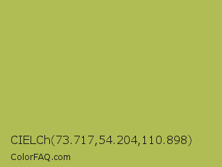 CIELCh 73.717,54.204,110.898 Color is a normal yellow color and the nearest color is Middle Green Yellow #acbf60. Hex code #b0bd54 and RGB value is rgb(176,189,84). In RGB color space, this color is composed of 69% red, 74% green, 33% blue, In CMYK color space, this color is composed of 7% cyan, 0% magenta, 56% yellow , 26% black , In HSL color space, this color has a hue angle of 67° , 44% saturation and 54% lightness.