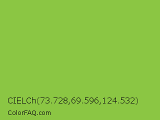 CIELCh 73.728,69.596,124.532 Color is a normal green color and the nearest color is Yellow Green #9acd32. Hex code #8bc643 and RGB value is rgb(139,198,67). In RGB color space, this color is composed of 55% red, 78% green, 26% blue, In CMYK color space, this color is composed of 30% cyan, 0% magenta, 66% yellow , 22% black , In HSL color space, this color has a hue angle of 87° , 53% saturation and 52% lightness.