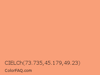 CIELCh 73.735,45.179,49.23 Color is a light orange color and the nearest color is Light Salmon #ffa07a. Hex code #f99f78 and RGB value is rgb(249,159,120). In RGB color space, this color is composed of 98% red, 62% green, 47% blue, In CMYK color space, this color is composed of 0% cyan, 36% magenta, 52% yellow , 2% black , In HSL color space, this color has a hue angle of 18° , 91% saturation and 72% lightness.