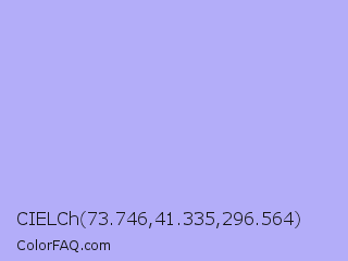 CIELCh 73.746,41.335,296.564 Color is a very light indigo color and the nearest color is Biloba Flower #b2a1ea. Hex code #b3adf9 and RGB value is rgb(179,173,249). In RGB color space, this color is composed of 70% red, 68% green, 98% blue, In CMYK color space, this color is composed of 28% cyan, 31% magenta, 0% yellow , 2% black , In HSL color space, this color has a hue angle of 245° , 86% saturation and 83% lightness.