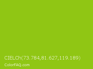 CIELCh 73.784,81.627,119.189 Color is a normal lime color and the nearest color is Pistachio Green #9dc209. Hex code #90c614 and RGB value is rgb(144,198,20). In RGB color space, this color is composed of 56% red, 78% green, 8% blue, In CMYK color space, this color is composed of 27% cyan, 0% magenta, 90% yellow , 22% black , In HSL color space, this color has a hue angle of 78° , 82% saturation and 43% lightness.