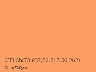 CIELCh 73.837,52.717,56.262 Color is a light orange color and the nearest color is Atomic Tangerine #ff9966. Hex code #fc9f66 and RGB value is rgb(252,159,102). In RGB color space, this color is composed of 99% red, 62% green, 40% blue, In CMYK color space, this color is composed of 0% cyan, 37% magenta, 60% yellow , 1% black , In HSL color space, this color has a hue angle of 23° , 96% saturation and 69% lightness.