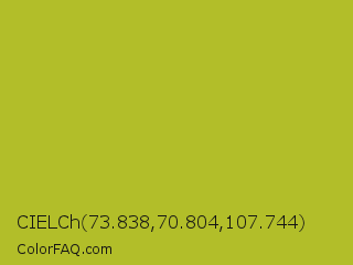 CIELCh 73.838,70.804,107.744 Color is a normal yellow color and the nearest color is Acid Green #b0bf1a. Hex code #b2be29 and RGB value is rgb(178,190,41). In RGB color space, this color is composed of 70% red, 75% green, 16% blue, In CMYK color space, this color is composed of 6% cyan, 0% magenta, 78% yellow , 25% black , In HSL color space, this color has a hue angle of 65° , 65% saturation and 45% lightness.