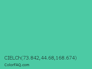 CIELCh 73.842,44.68,168.674 Color is a normal green color and the nearest color is Eucalyptus #44d7a8. Hex code #4ccaa4 and RGB value is rgb(76,202,164). In RGB color space, this color is composed of 30% red, 79% green, 64% blue, In CMYK color space, this color is composed of 62% cyan, 0% magenta, 19% yellow , 21% black , In HSL color space, this color has a hue angle of 162° , 54% saturation and 55% lightness.