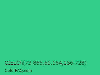 CIELCh 73.866,61.164,156.728 Color is a normal green color and the nearest color is Shamrock #33cc99. Hex code #2fce87 and RGB value is rgb(47,206,135). In RGB color space, this color is composed of 18% red, 81% green, 53% blue, In CMYK color space, this color is composed of 77% cyan, 0% magenta, 34% yellow , 19% black , In HSL color space, this color has a hue angle of 153° , 63% saturation and 50% lightness.