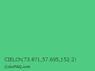 CIELCh 73.871,57.695,152.2 Color is a normal green color and the nearest color is Emerald #50c878. Hex code #50cc82 and RGB value is rgb(80,204,130). In RGB color space, this color is composed of 31% red, 80% green, 51% blue, In CMYK color space, this color is composed of 61% cyan, 0% magenta, 36% yellow , 20% black , In HSL color space, this color has a hue angle of 144° , 55% saturation and 56% lightness.