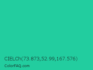 CIELCh 73.873,52.99,167.576 Color is a normal cyan color and the nearest color is Shamrock #33cc99. Hex code #22cd9f and RGB value is rgb(34,205,159). In RGB color space, this color is composed of 13% red, 80% green, 62% blue, In CMYK color space, this color is composed of 83% cyan, 0% magenta, 22% yellow , 20% black , In HSL color space, this color has a hue angle of 164° , 72% saturation and 47% lightness.