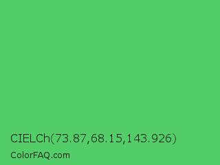 CIELCh 73.87,68.15,143.926 Color is a normal green color and the nearest color is Emerald #50c878. Hex code #53cd68 and RGB value is rgb(83,205,104). In RGB color space, this color is composed of 33% red, 80% green, 41% blue, In CMYK color space, this color is composed of 60% cyan, 0% magenta, 49% yellow , 20% black , In HSL color space, this color has a hue angle of 130° , 55% saturation and 56% lightness.