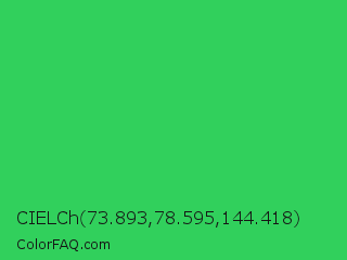 CIELCh 73.893,78.595,144.418 Color is a normal green color and the nearest color is UFO Green #3cd070. Hex code #31d05c and RGB value is rgb(49,208,92). In RGB color space, this color is composed of 19% red, 82% green, 36% blue, In CMYK color space, this color is composed of 76% cyan, 0% magenta, 56% yellow , 18% black , In HSL color space, this color has a hue angle of 136° , 63% saturation and 50% lightness.