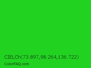 CIELCh 73.897,98.264,136.722 Color is a normal green color and the nearest color is Lime Green #32cd32. Hex code #22d221 and RGB value is rgb(34,210,33). In RGB color space, this color is composed of 13% red, 82% green, 13% blue, In CMYK color space, this color is composed of 84% cyan, 0% magenta, 84% yellow , 18% black , In HSL color space, this color has a hue angle of 120° , 73% saturation and 48% lightness.