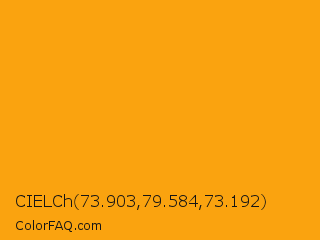 CIELCh 73.903,79.584,73.192 Color is a normal orange color and the nearest color is Dark Tangerine #ffa812. Hex code #faa30f and RGB value is rgb(250,163,15). In RGB color space, this color is composed of 98% red, 64% green, 6% blue, In CMYK color space, this color is composed of 0% cyan, 35% magenta, 94% yellow , 2% black , In HSL color space, this color has a hue angle of 38° , 96% saturation and 52% lightness.