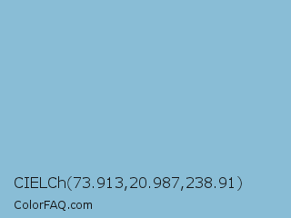 CIELCh 73.913,20.987,238.91 Color is a light blue color and the nearest color is Dark Sky Blue #8cbed6. Hex code #89bdd6 and RGB value is rgb(137,189,214). In RGB color space, this color is composed of 54% red, 74% green, 84% blue, In CMYK color space, this color is composed of 36% cyan, 12% magenta, 0% yellow , 16% black , In HSL color space, this color has a hue angle of 199° , 48% saturation and 69% lightness.