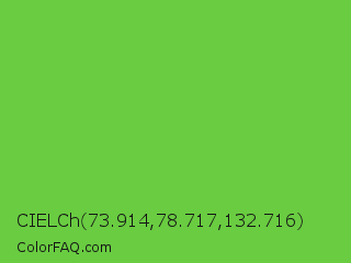 CIELCh 73.914,78.717,132.716 Color is a normal green color and the nearest color is Green RYB #66b032. Hex code #69cc41 and RGB value is rgb(105,204,65). In RGB color space, this color is composed of 41% red, 80% green, 25% blue, In CMYK color space, this color is composed of 49% cyan, 0% magenta, 68% yellow , 20% black , In HSL color space, this color has a hue angle of 103° , 58% saturation and 53% lightness.
