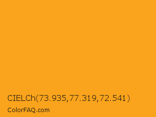 CIELCh 73.935,77.319,72.541 Color is a normal orange color and the nearest color is Tree Poppy #fc9c1d. Hex code #faa31c and RGB value is rgb(250,163,28). In RGB color space, this color is composed of 98% red, 64% green, 11% blue, In CMYK color space, this color is composed of 0% cyan, 35% magenta, 89% yellow , 2% black , In HSL color space, this color has a hue angle of 36° , 96% saturation and 55% lightness.