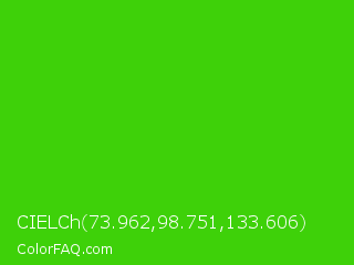 CIELCh 73.962,98.751,133.606 Color is a normal green color and the nearest color is Harlequin Green #46cb18. Hex code #3ed109 and RGB value is rgb(62,209,9). In RGB color space, this color is composed of 24% red, 82% green, 4% blue, In CMYK color space, this color is composed of 70% cyan, 0% magenta, 96% yellow , 18% black , In HSL color space, this color has a hue angle of 104° , 92% saturation and 43% lightness.