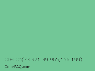 CIELCh 73.971,39.965,156.199 Color is a light green color and the nearest color is De York #7ac488. Hex code #72c797 and RGB value is rgb(114,199,151). In RGB color space, this color is composed of 45% red, 78% green, 59% blue, In CMYK color space, this color is composed of 43% cyan, 0% magenta, 24% yellow , 22% black , In HSL color space, this color has a hue angle of 146° , 43% saturation and 61% lightness.