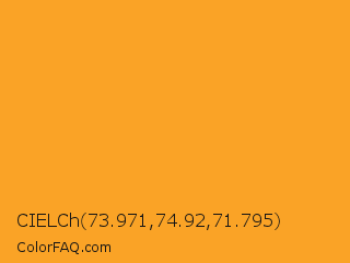 CIELCh 73.971,74.92,71.795 Color is a normal orange color and the nearest color is Sea Buckthorn #fba129. Hex code #faa326 and RGB value is rgb(250,163,38). In RGB color space, this color is composed of 98% red, 64% green, 15% blue, In CMYK color space, this color is composed of 0% cyan, 35% magenta, 85% yellow , 2% black , In HSL color space, this color has a hue angle of 35° , 95% saturation and 56% lightness.