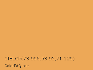 CIELCh 73.996,53.95,71.129 Color is a light orange color and the nearest color is Indian Yellow #e3a857. Hex code #eda857 and RGB value is rgb(237,168,87). In RGB color space, this color is composed of 93% red, 66% green, 34% blue, In CMYK color space, this color is composed of 0% cyan, 29% magenta, 63% yellow , 7% black , In HSL color space, this color has a hue angle of 32° , 81% saturation and 64% lightness.
