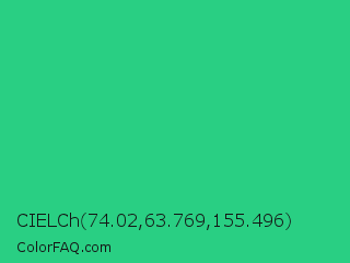 CIELCh 74.02,63.769,155.496 Color is a normal green color and the nearest color is Shamrock #33cc99. Hex code #29cf83 and RGB value is rgb(41,207,131). In RGB color space, this color is composed of 16% red, 81% green, 51% blue, In CMYK color space, this color is composed of 80% cyan, 0% magenta, 37% yellow , 19% black , In HSL color space, this color has a hue angle of 153° , 67% saturation and 49% lightness.