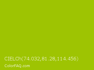 CIELCh 74.032,81.28,114.456 Color is a normal lime color and the nearest color is Pistachio Green #9dc209. Hex code #9ec402 and RGB value is rgb(158,196,2). In RGB color space, this color is composed of 62% red, 77% green, 1% blue, In CMYK color space, this color is composed of 19% cyan, 0% magenta, 99% yellow , 23% black , In HSL color space, this color has a hue angle of 72° , 98% saturation and 39% lightness.