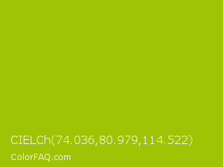 CIELCh 74.036,80.979,114.522 Color is a normal lime color and the nearest color is Pistachio Green #9dc209. Hex code #9ec405 and RGB value is rgb(158,196,5). In RGB color space, this color is composed of 62% red, 77% green, 2% blue, In CMYK color space, this color is composed of 19% cyan, 0% magenta, 97% yellow , 23% black , In HSL color space, this color has a hue angle of 72° , 95% saturation and 39% lightness.