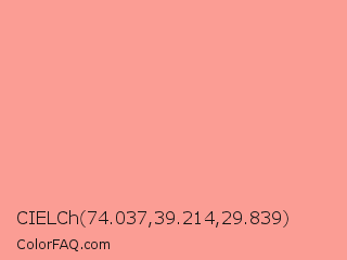 CIELCh 74.037,39.214,29.839 Color is a light red color and the nearest color is Mona Lisa #ffa194. Hex code #fb9d94 and RGB value is rgb(251,157,148). In RGB color space, this color is composed of 98% red, 62% green, 58% blue, In CMYK color space, this color is composed of 0% cyan, 37% magenta, 41% yellow , 2% black , In HSL color space, this color has a hue angle of 5° , 93% saturation and 78% lightness.