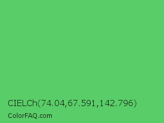 CIELCh 74.04,67.591,142.796 Color is a normal green color and the nearest color is Emerald #50c878. Hex code #59cd67 and RGB value is rgb(89,205,103). In RGB color space, this color is composed of 35% red, 80% green, 40% blue, In CMYK color space, this color is composed of 57% cyan, 0% magenta, 50% yellow , 20% black , In HSL color space, this color has a hue angle of 127° , 54% saturation and 58% lightness.