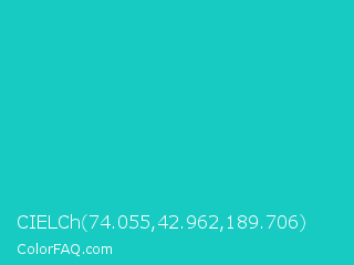 CIELCh 74.055,42.962,189.706 Color is a normal cyan color and the nearest color is Java #1fc2c2. Hex code #17cbc2 and RGB value is rgb(23,203,194). In RGB color space, this color is composed of 9% red, 80% green, 76% blue, In CMYK color space, this color is composed of 89% cyan, 0% magenta, 4% yellow , 20% black , In HSL color space, this color has a hue angle of 177° , 80% saturation and 44% lightness.