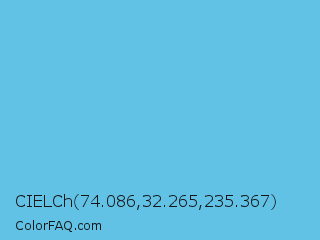 CIELCh 74.086,32.265,235.367 Color is a light blue color and the nearest color is Viking #64ccdb. Hex code #61c2e6 and RGB value is rgb(97,194,230). In RGB color space, this color is composed of 38% red, 76% green, 90% blue, In CMYK color space, this color is composed of 58% cyan, 16% magenta, 0% yellow , 10% black , In HSL color space, this color has a hue angle of 196° , 73% saturation and 64% lightness.